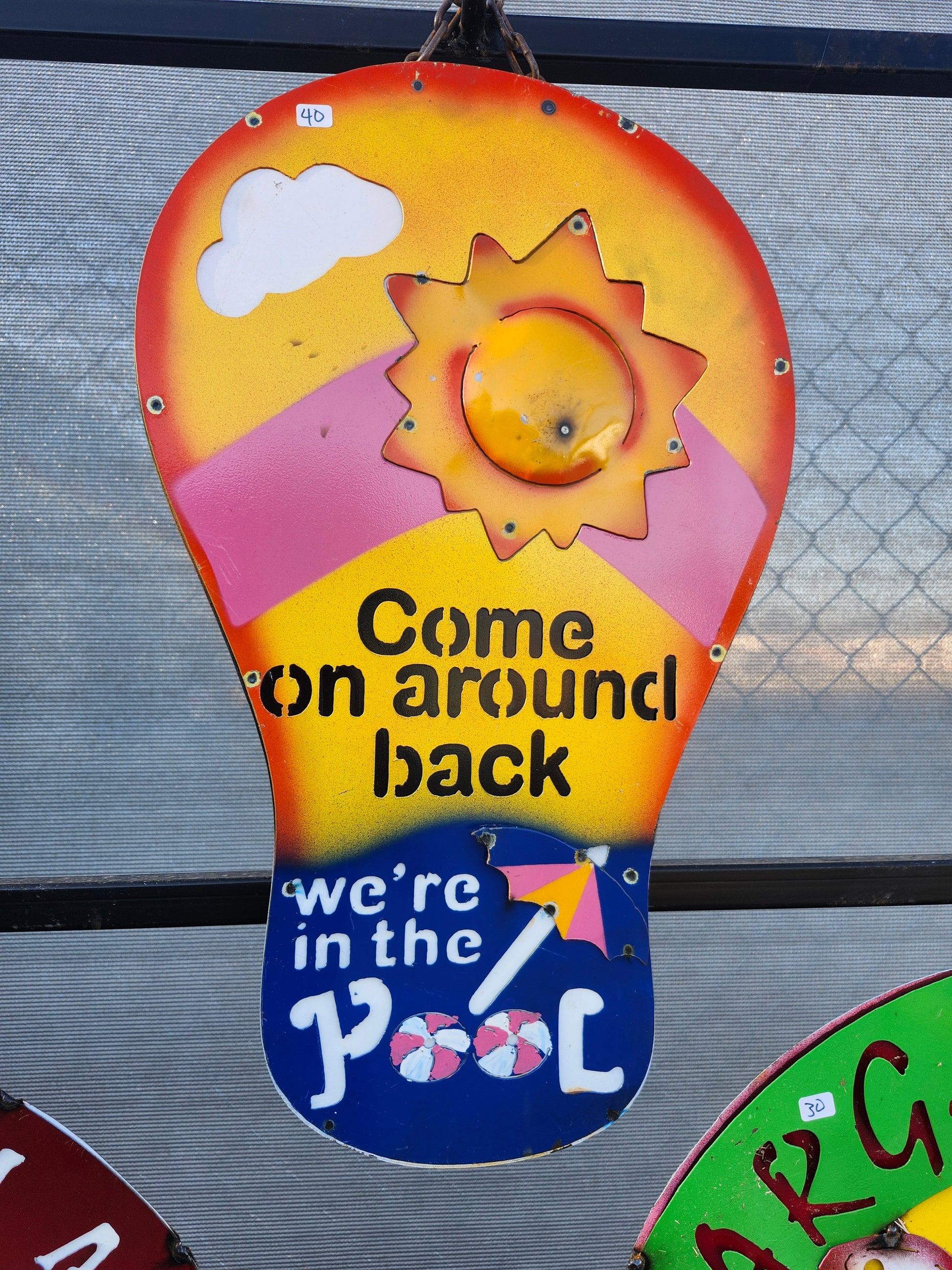Come around back metal hanging sign